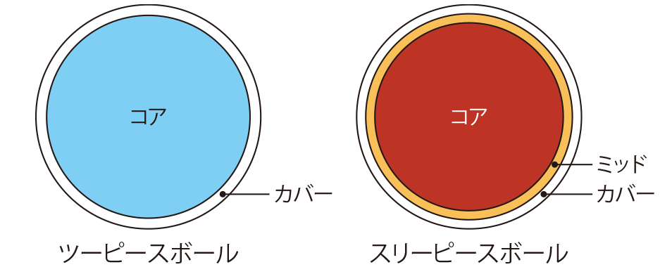 コアを1層のカバーで包んだボールが2ピースボールです。コアやカバーの硬度を変えることでそれぞれのスイングに対応。非力なスイング用には柔らかくて潰れやすいコアを、力のあるスイング用には比較的硬いコアを使います。カバーには硬度のあるアイオノマー樹脂の使用が一般的です。